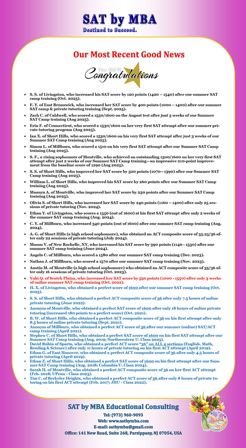 S. S. of Livingston, who increasded his SAT score by 120 points (1420 - 1540) after our summer SAT camp training (Oct. 2025).