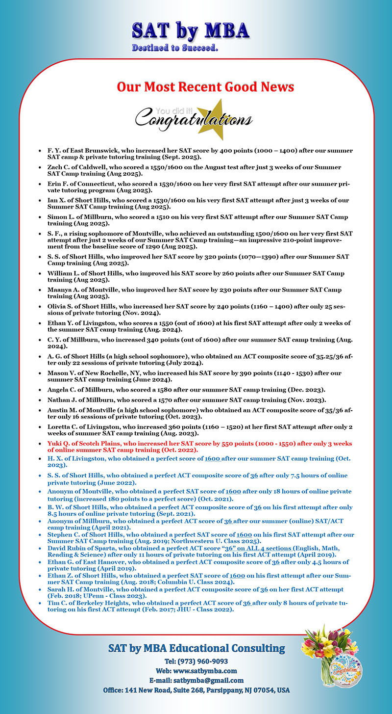 C. Y. of Millburn, who increased her SAT score by 340 points after our summer SAT camp training. (Aug 2024)